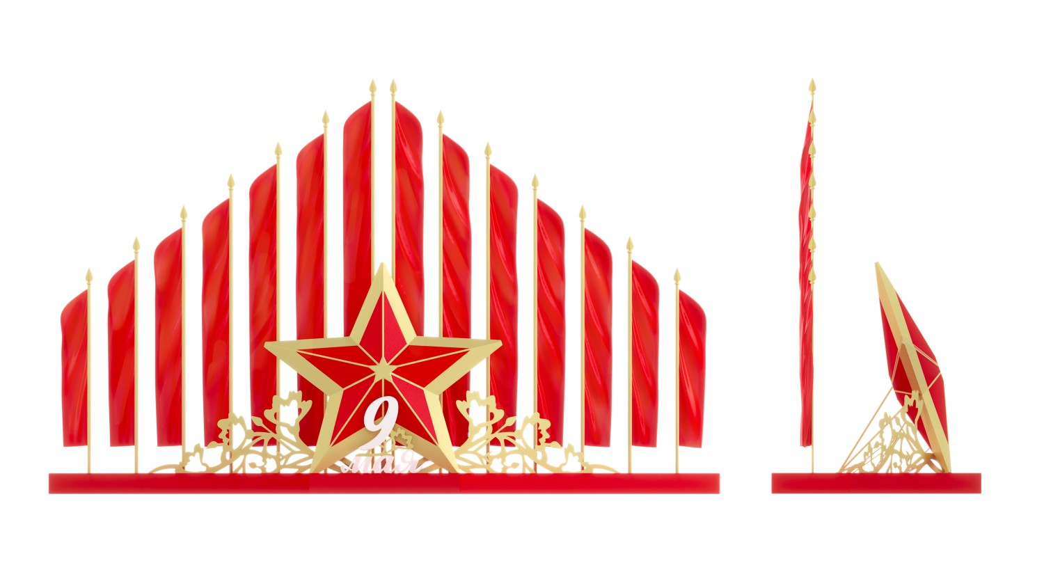 Флаговая конструкция с центральным образом звезды, как традиционного символа победы, в окружении ажурной композиции с гвоздиками, подчеркнет праздничную атмосферу городских площадей.