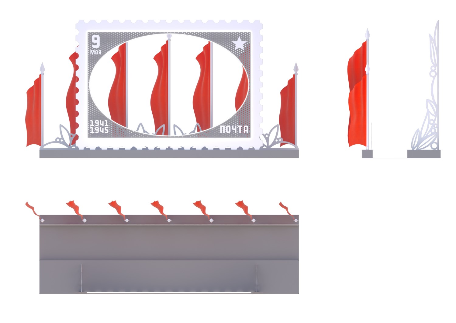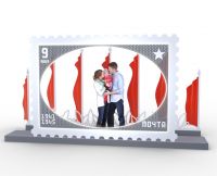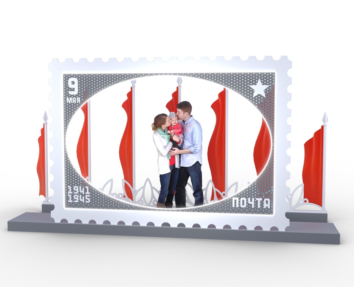 Фотозона "Почтовая марка", габариты 4600х1400х2450 мм, перфорированный металлический лист в порошковом окрасе, световой шнур, металлический каркас, флаги 7 шт.