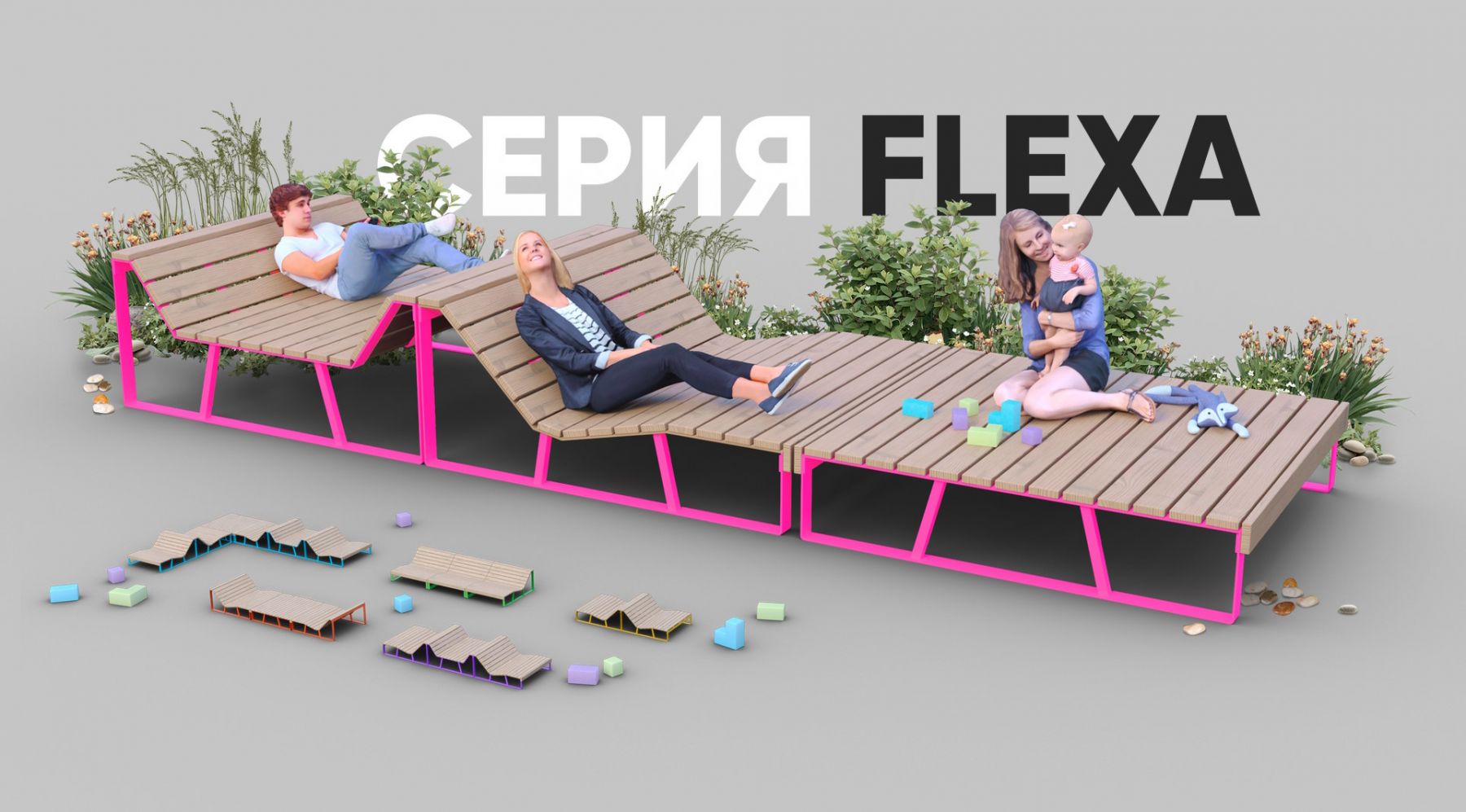 Серия "Flexa" – это модульная уличная мебель для отдыха, предназначенная для использования в общественных местах и частных участках.