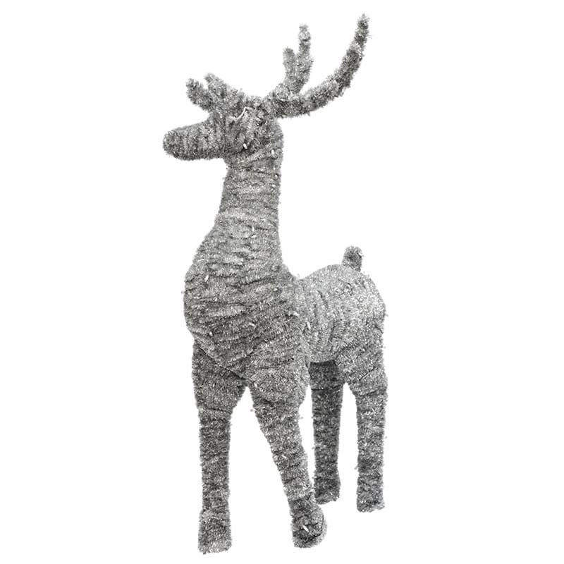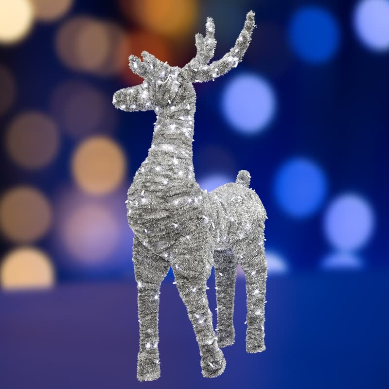 Световая фигура «Олень — динамика» мишура серебро 1,3м – яркий, красивый элемент для украшения не только городских площадей и парков, но и территории загородных коттеджей, создаст сказочную праздничную атмосферу в торговых центрах, магазинах и кафе, сделает ваш дизайн запоминающимся. Такая фигура постоянно будет притягивать взгляды даже с дальнего расстояния и поднимать настроение. Фигура изготовлена из проволоки диаметром 5 мм. Светодиоды уличные ( IP 68) в количестве 240 штук белого свечения. Цвет мишуры — серебряный