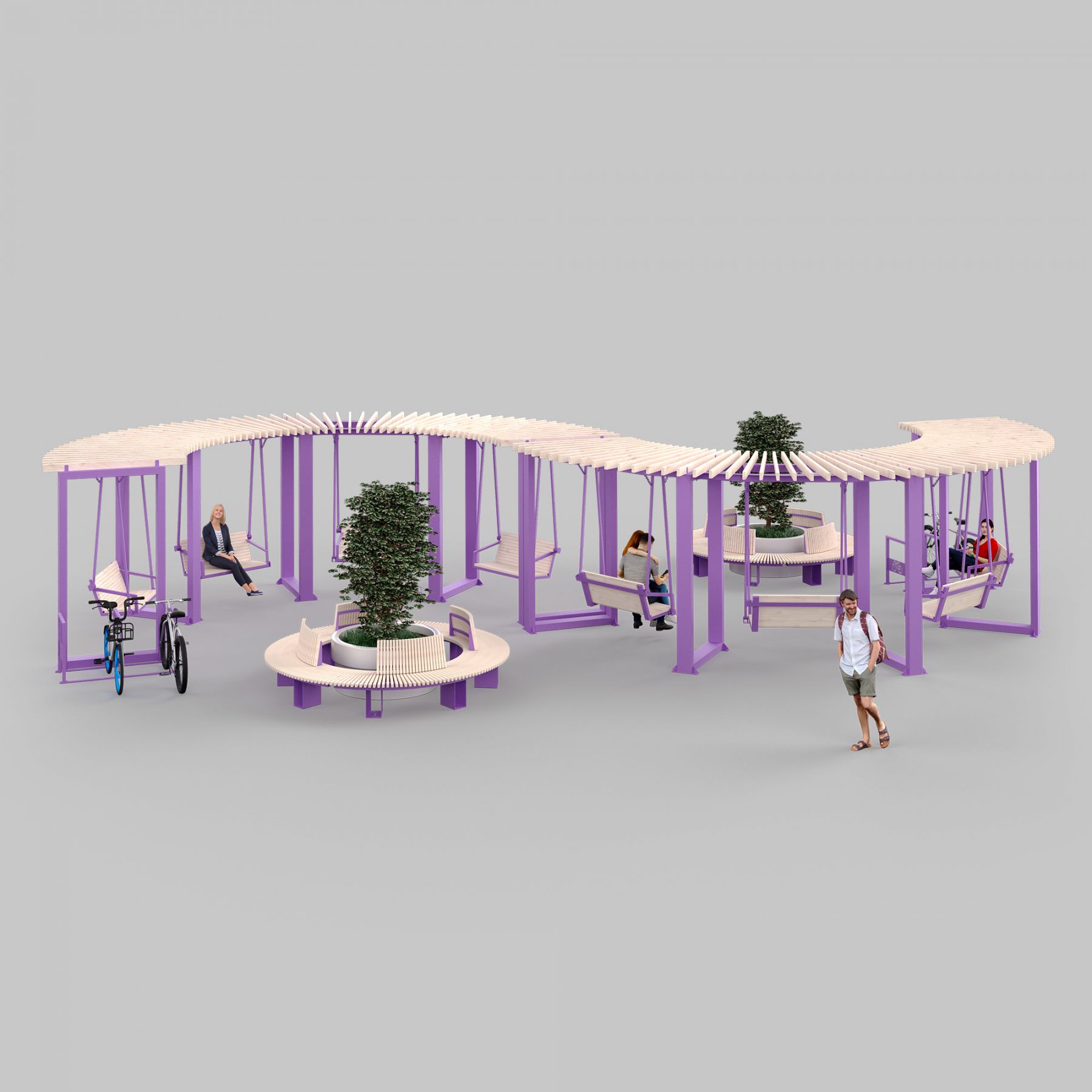 Серия основана на каркасных металлических вертикальных элементах и жестких угловых формах, с применением характерного покрытия древесным брусом. Этот принцип формирует композицию, обеспечивая целостность и лёгкость интеграции в городскую среду.