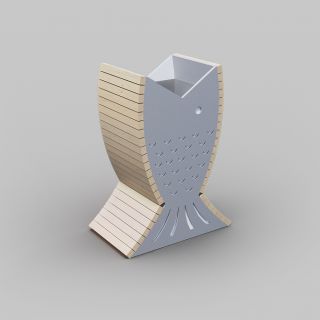 Урна "Рыба-мусороед" выполнена в форме рыбы с открытым ртом, стоящей на хвосте. Поставляется с оцинкованным вкладышем, который подчеркивает декоративную "чешую", просматриваясь сквозь прорези.